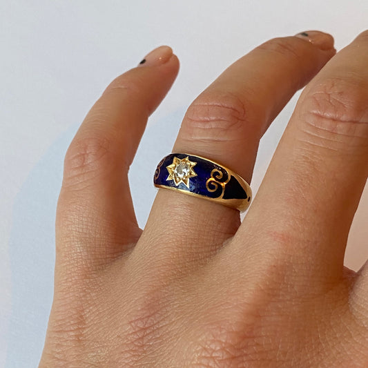 Vintage Solid 18ct Gold, Blue Enamel and Brilliant-cut Diamond Starburst Ring | Size UK K.5