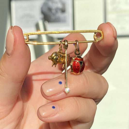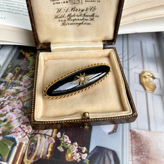 Antique 9ct Gold, Jet & Seed Pearl Brooch